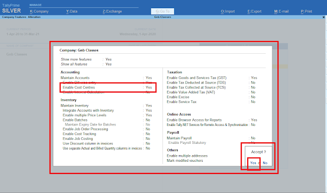 - अब ctrl + P दबा कर कॉन्फ़िगरेशन में जाएँ और यहाँ Show Cost Center Details को YES करें|